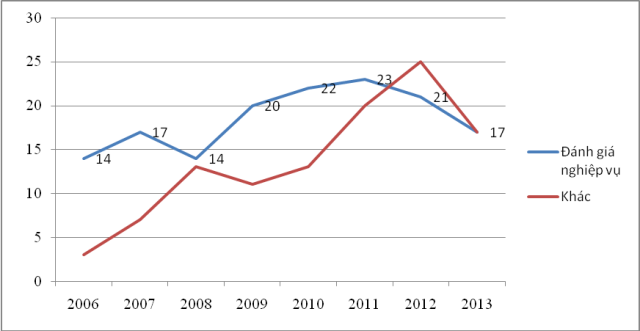 Trong những năm gần đây xu hướng chọn các đề tại “đánh giá nghiệp vụ” có giảm (từ mức cao 82%) xuống mức khoảng 50% trong những năm gần đây. Tuy nhiên mức giảm không ổn định và giảm rất thấp trong những năm gần đây và luôn duy trì ở mức trên 50% (hình 3). Cá biệt trong một số ngành như ngành kinh tế chính trị, kinh tế quản lý gần như 100% các nghiên cứu là “đánh giá nghiệp vụ”. Điều đó cho thấy thực trạng ảm đạm và rất ít cải tiến trong việc lựa chọn đề tài nghiên cứu đảm bảo theo các chuẩn mực khoa học tối thiểu.