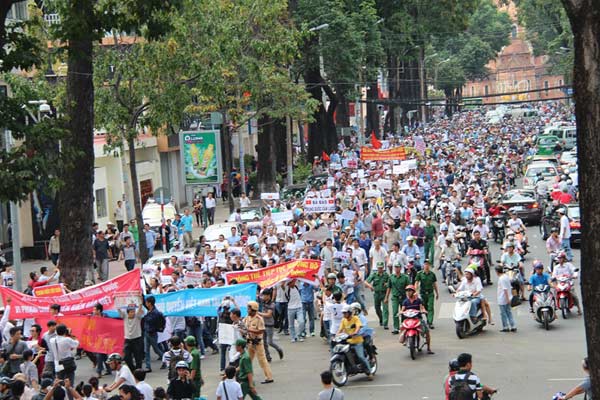 Không chỉ trước Nhà hát TP, nhiều ngả đường ở TP.HCM người dân cũng xuống đường diễu hành tỏ thái độ phản đối TQ. Dọc đường Đồng Khởi (quận 1), nhà thờ Đức Bà, Phạm Ngọc Thạch, Trần Cao Vân, Hai Bà Trưng, nhiều băng rôn và biểu ngữ được giương cao trong trật tự.