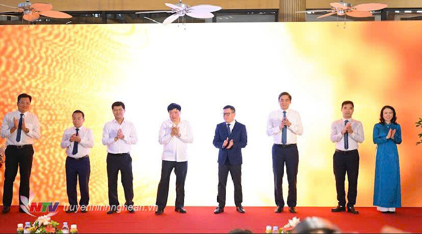 Các đại biểu thực hiện nghi thức ra mắt chuyên trang báo chí dữ liệu Cao trào Xô viết Nghệ Tĩnh.