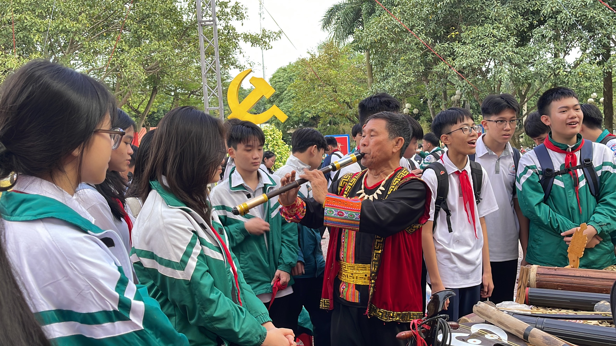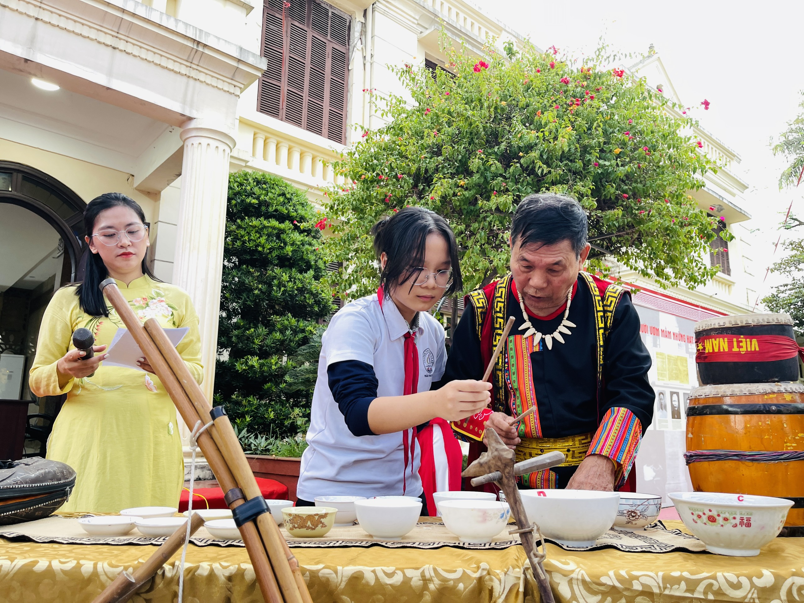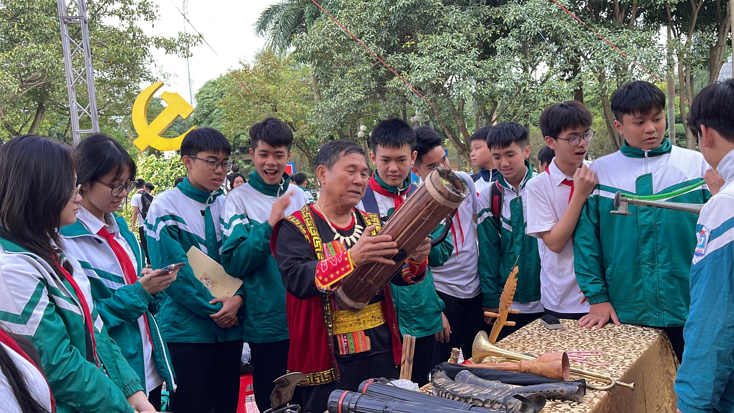 Tham gia chương trình, các em học sinh được tận mắt thấy trên dưới 30 sản phẩm nhạc cụ, gồm đủ các bộ như: Hơi (sáo, tiêu, khèn, tù và, đàn môi…); Dây (đàn bầu, thập lục huyền cầm, nhị, đàn đáy…), Da (trống cơm, trống tầm vông…); Gõ (tơ-rưng, đàn đá, đàn bát…). Các em được nghệ nhân giới thiệu về cách làm, cách sử dụng và không gian sử dụng các nhạc cụ của từng dân tộc, được thưởng thức các màn đánh đàn bầu, đàn đá, đàn tơ rưng, các loại kèn, sáo khác nhau và đặc biệt là màn biểu diễn đàn bát độc đáo. Với một dãy bát với đủ các kích cỡ, chỉ với một đôi đũa, nghệ nhân say sưa nhập tâm trên từng chiếc bát, hòa điệu hát bài “Chiếc khăn piêu”, “Nổi lửa lên em”, “Tiếng đàn Ta Lư”… một cách điêu luyện, đủ các cung bậc âm thanh từ thấp đến cao.