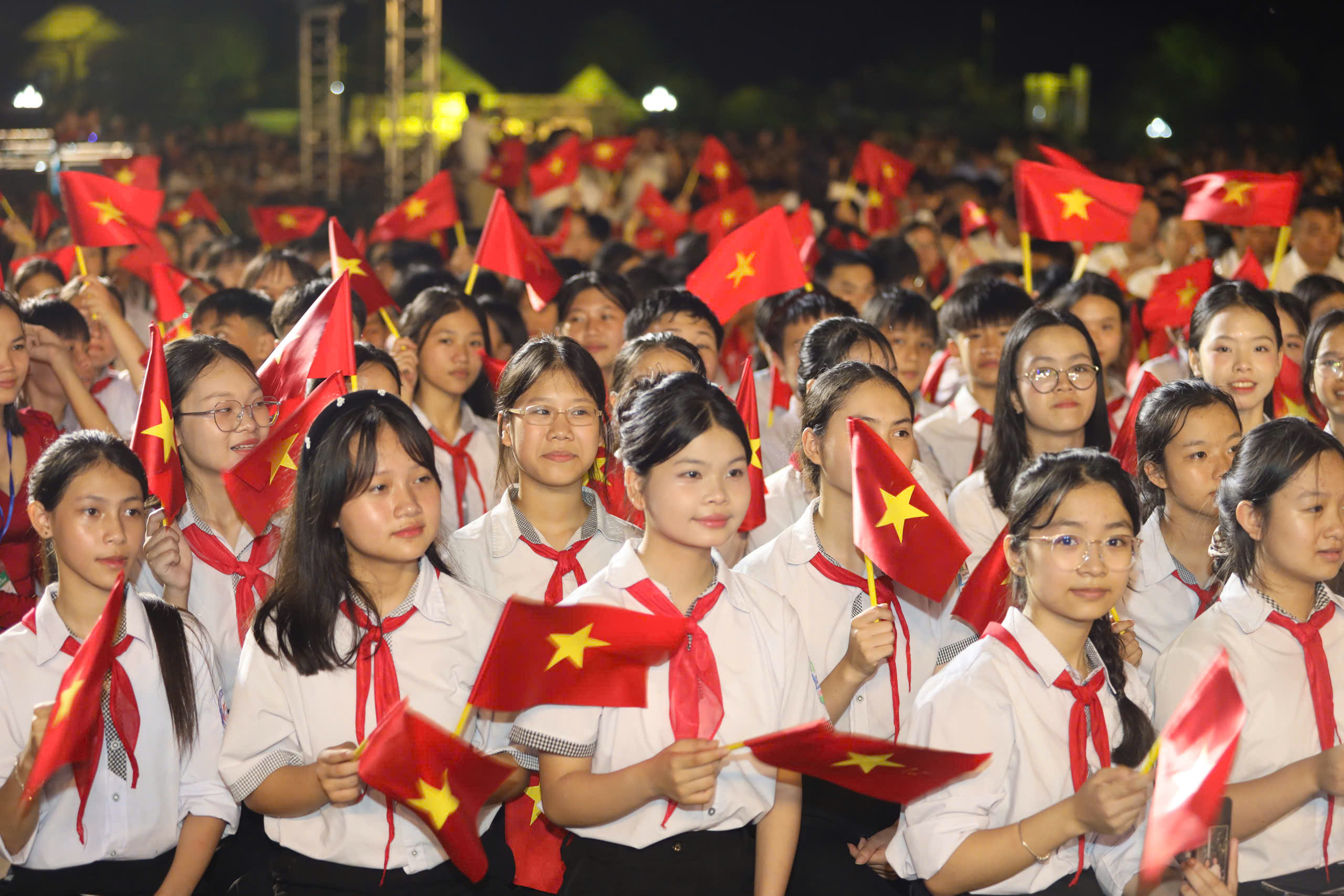 Các em học sinh với những lá cờ đỏ sao vàng trong đêm khai mạc.