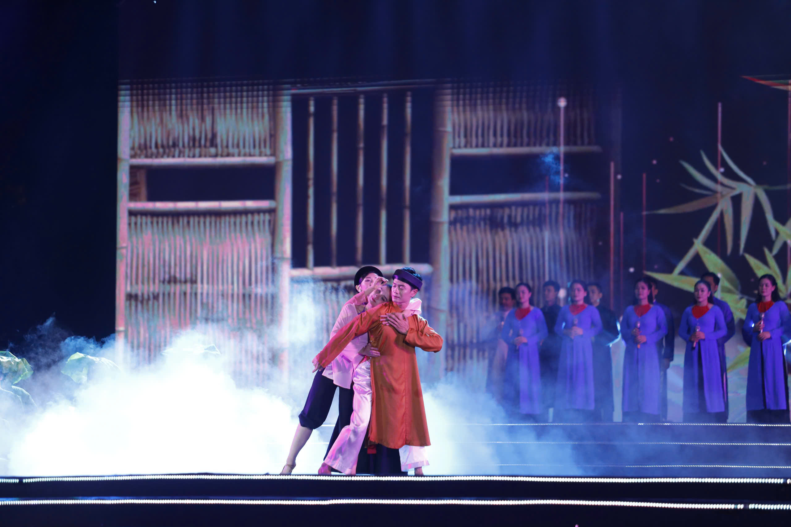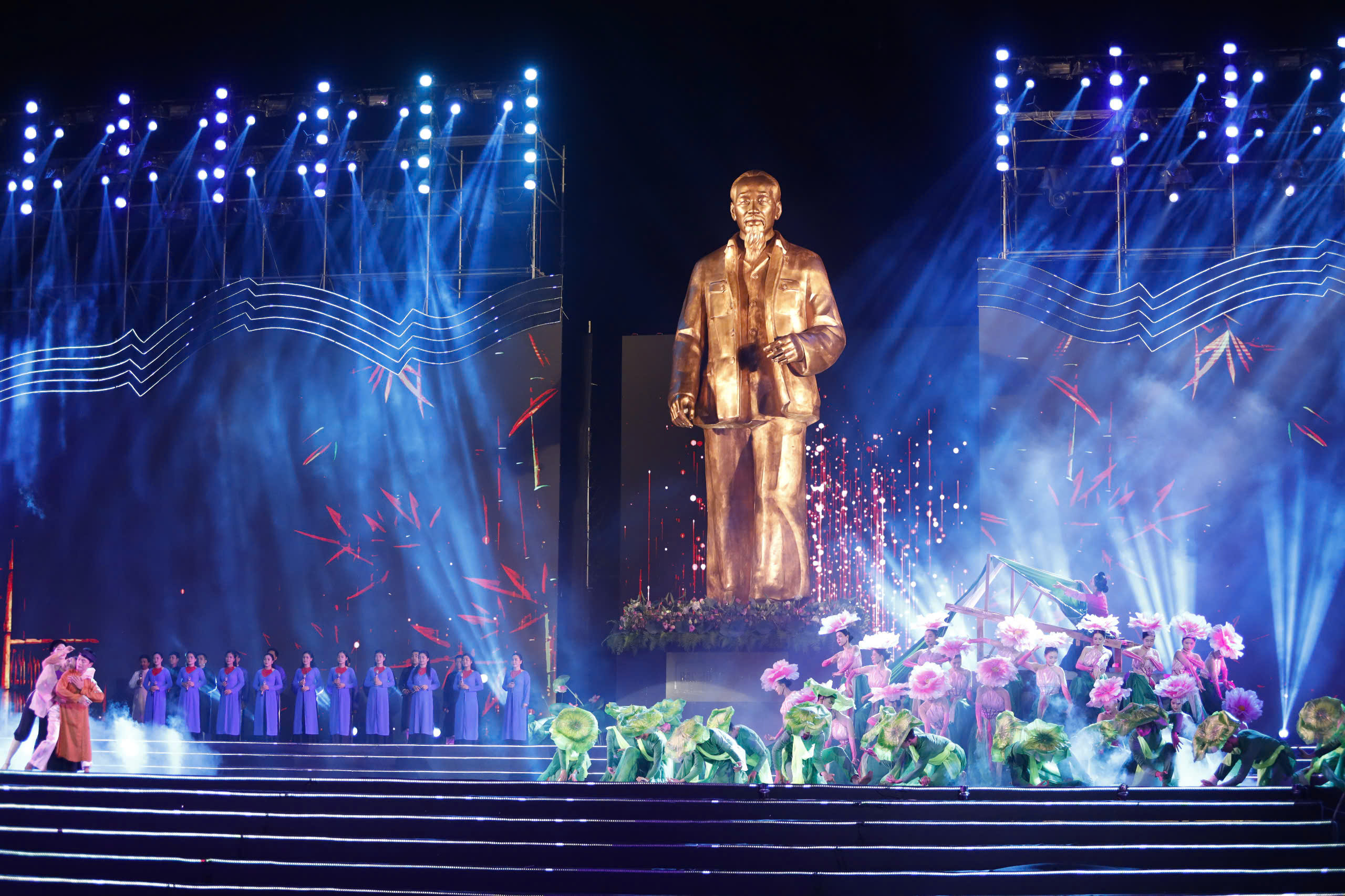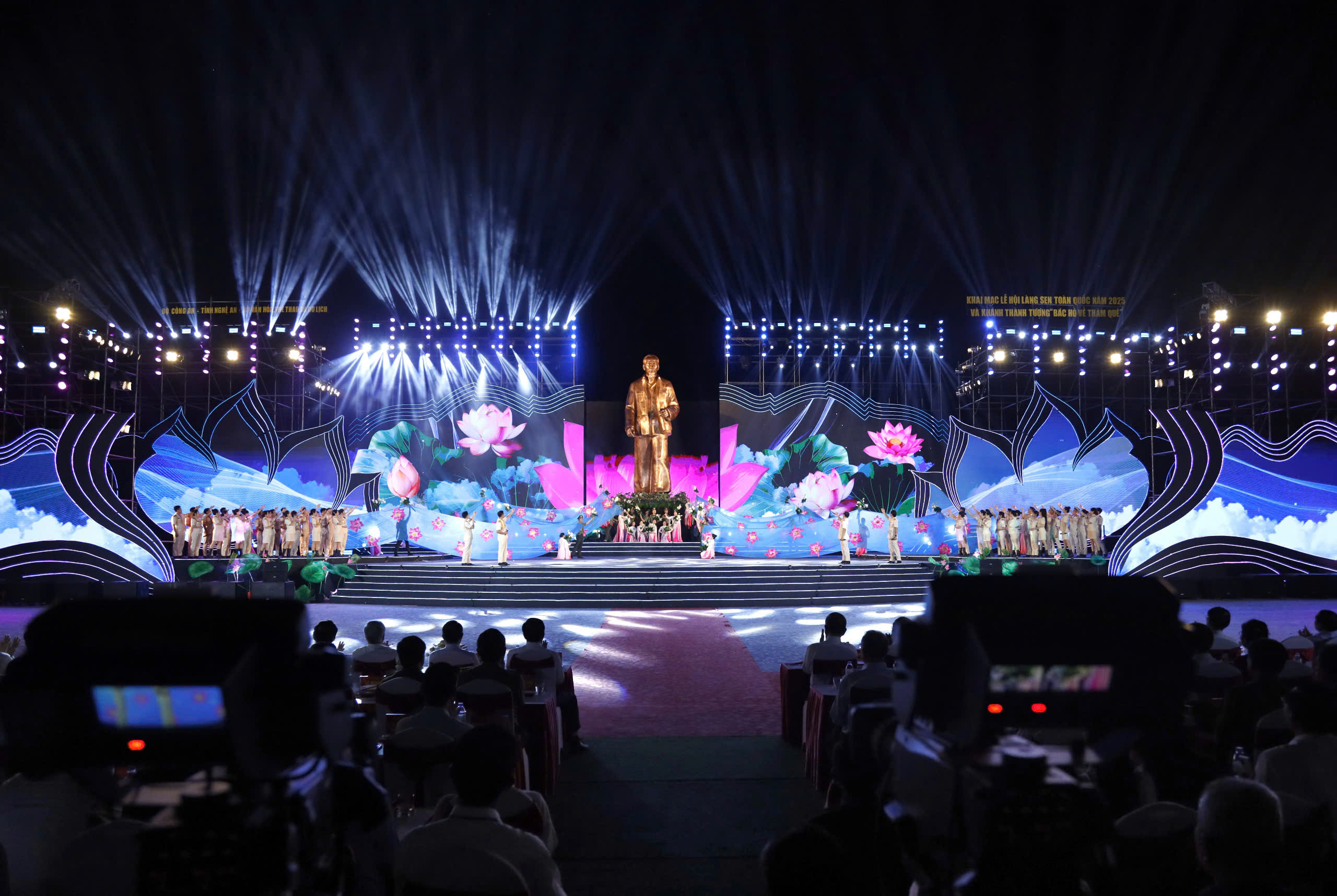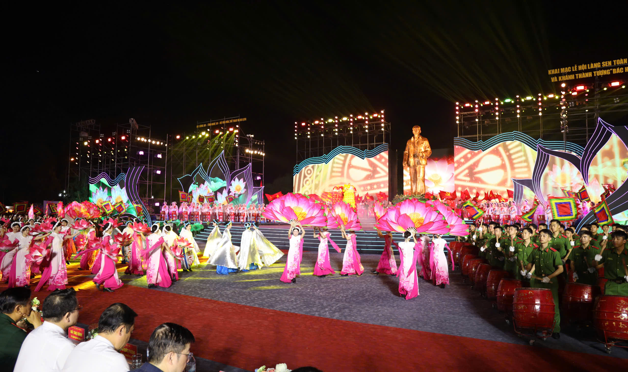 Chương trình Khai mạc Lễ hội Làng Sen là chương trình nghệ thuật “Tượng đài trong muôn triệu trái tim” được giàn dựng công phu.