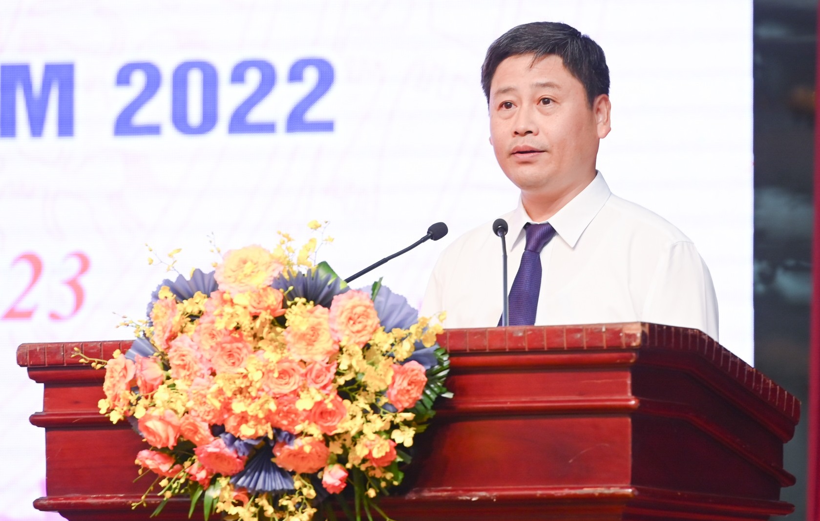 Đồng chí Trần Minh Ngọc - Chủ tịch Hội Nhà báo tỉnh, Giám đốc Đài PT-TH tỉnh phát biểu tại buổi lễ. Ảnh: Thành Cường