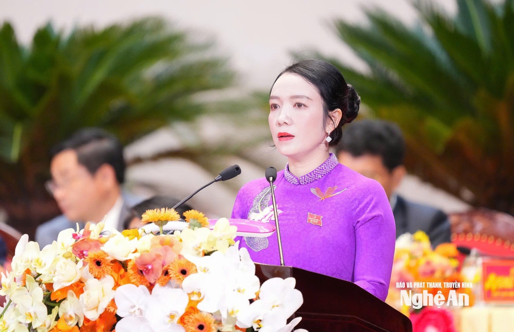 Bà Trần Thị Mỹ Hạnh, UV BCH Đảng bộ tỉnh, Giám đốc Sở VHTTDL phát biểu tham luận “Văn hóa – Sức mạnh nội sinh, động lực phát triển Nghệ An trong kỷ nguyên mới” tại Đại hội
