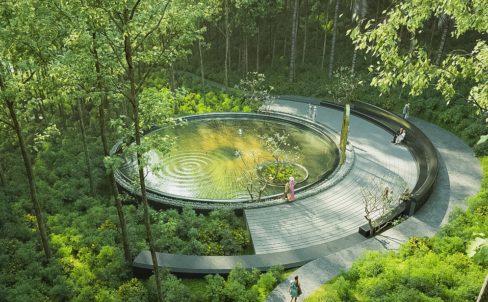 Điểm nhấn Hồ nước tròn trung tâm của Thác 9 tầng tại Khu mộ bà Hoàng Thị Loan.